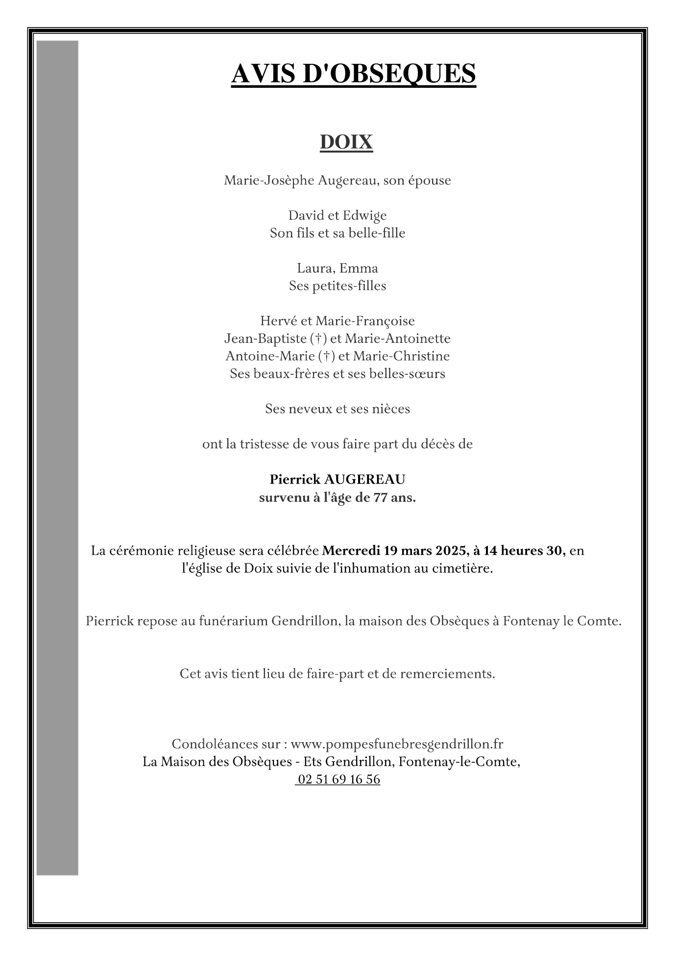 Cet espace « condoléances » est dédié à la mémoire de Monsieur Pierrick AUGEREAU.