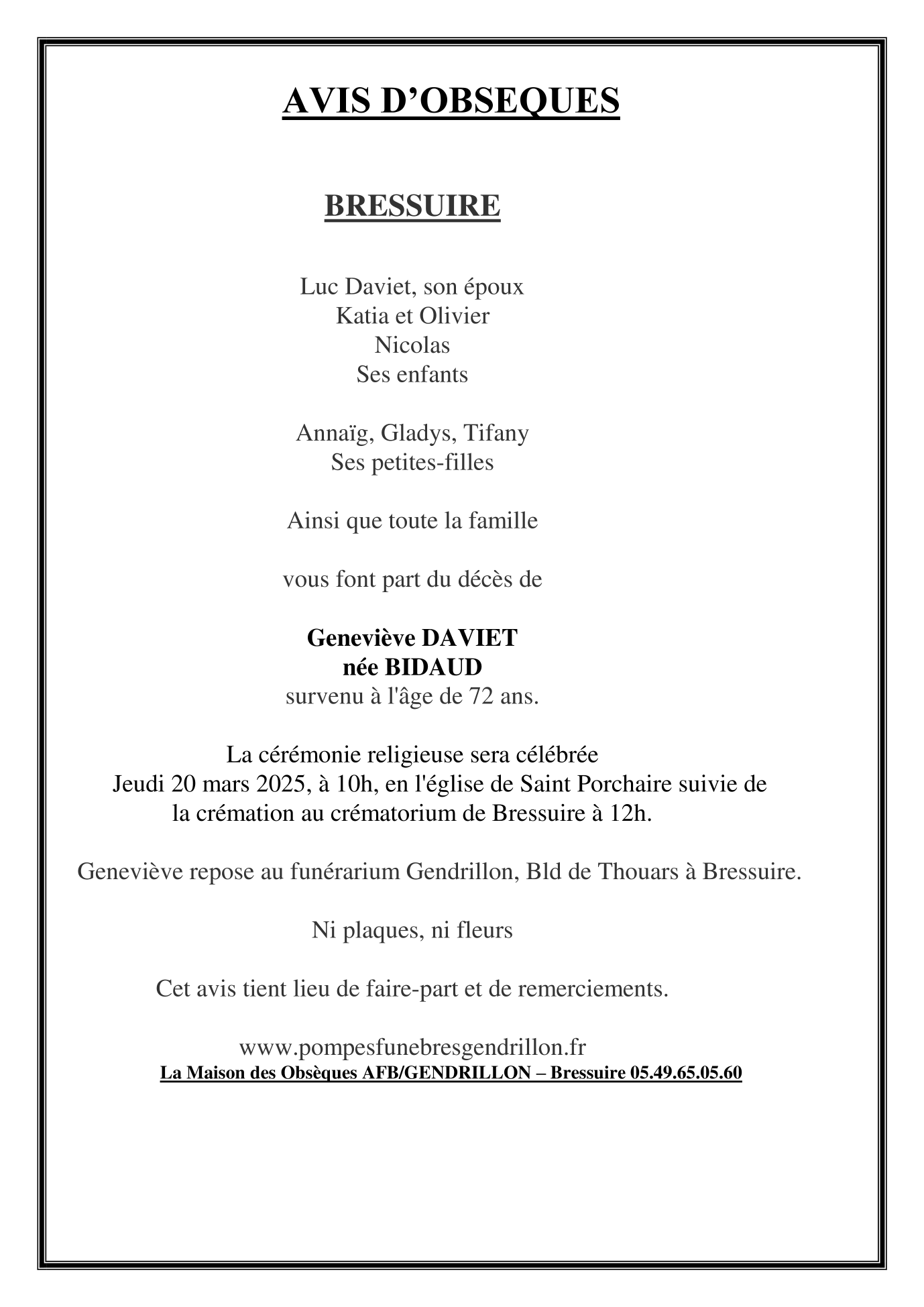 de Madame Geneviève DAVIET née BIDAUD