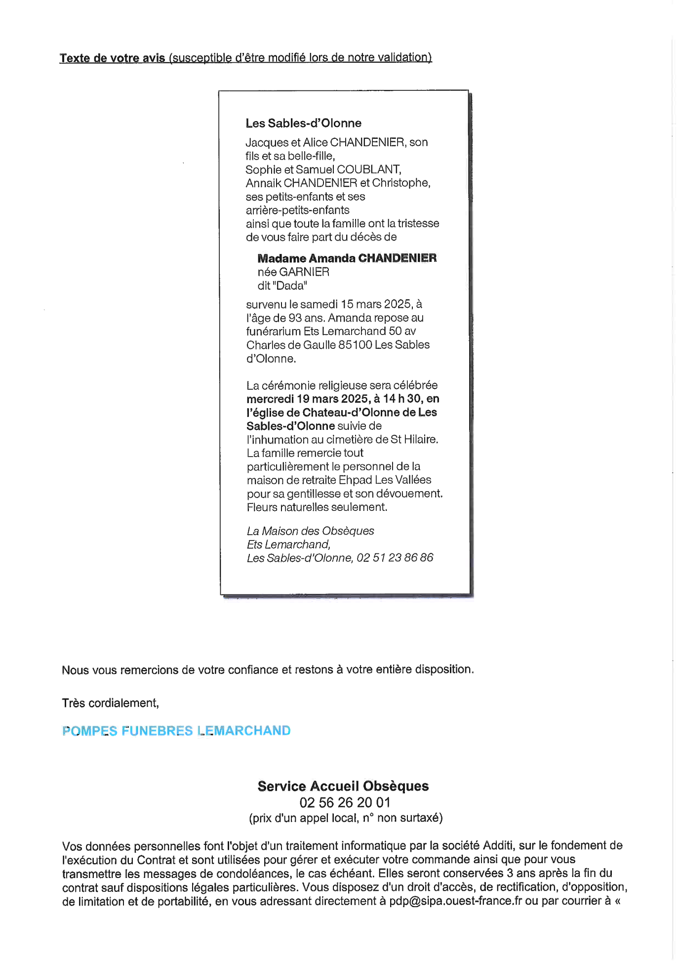 Cet espace « condoléances » est dédié à la mémoire de Madame Amanda née GARNIER.
