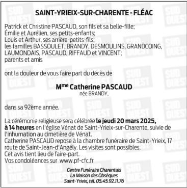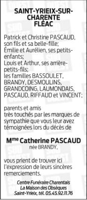 Cet espace « condoléances » est dédié à la mémoire de Madame Catherine PASCAUD née BRANDY.