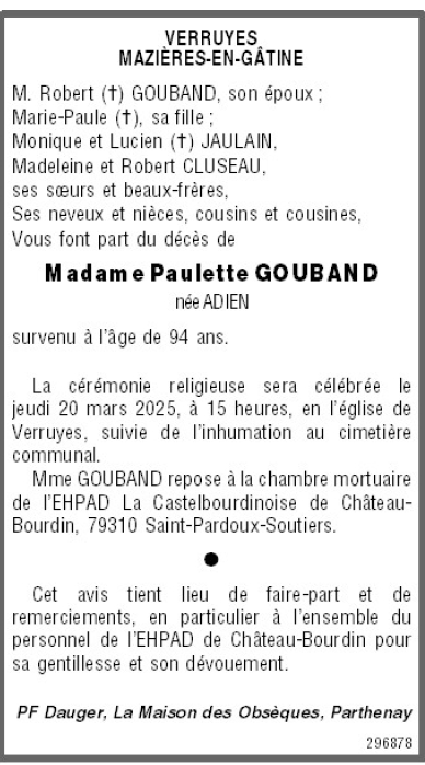 Cet espace « condoléances » est dédié à la mémoire de Madame Paulette GOUBAND née ADIEN.