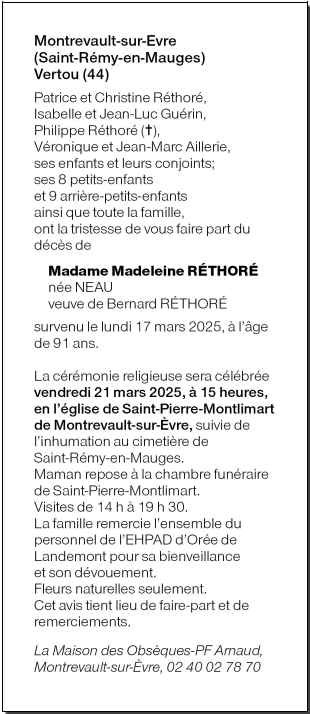 Cet espace « condoléances » est dédié à la mémoire de Madame Madeleine RÉTHORÉ née NEAU.