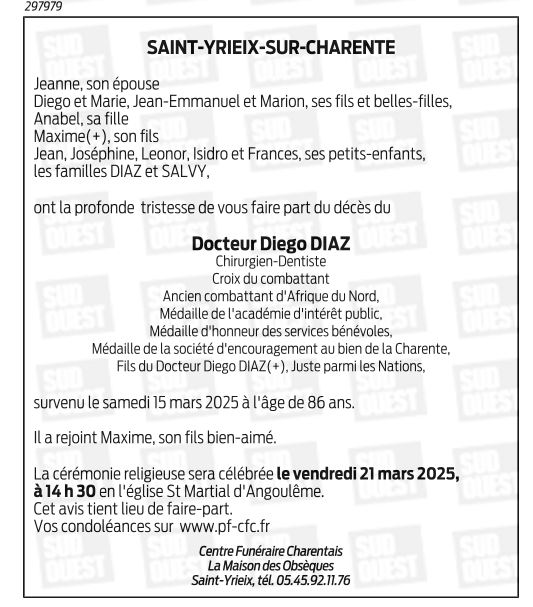 Cet espace « condoléances » est dédié à la mémoire de Docteur Diego DIAZ.