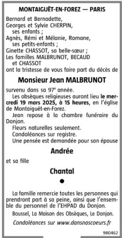 Cet espace « condoléances » est dédié à la mémoire de Monsieur Jean MALBRUNOT.
