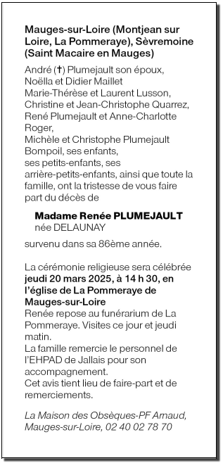 Cet espace « condoléances » est dédié à la mémoire de Madame Renée PLUMEJAULT née DELAUNAY.