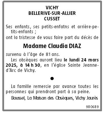 Cet espace « condoléances » est dédié à la mémoire de Madame Claudia DIAZ née GONZALEZ GONZALEZ.