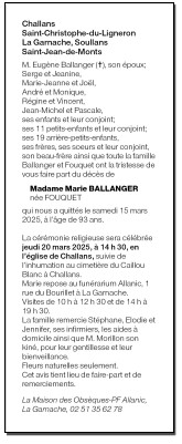 Cet espace « condoléances » est dédié à la mémoire de Madame Marie BALLANGER née FOUQUET.