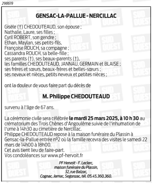 Cet espace « condoléances » est dédié à la mémoire de Monsieur Philippe CHEDOUTEAUD.