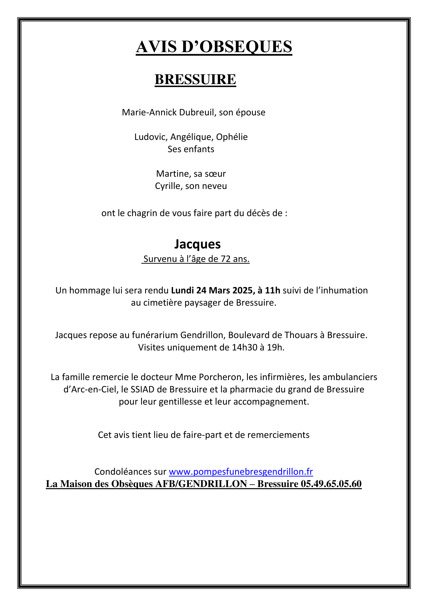 Cet espace « condoléances » est dédié à la mémoire de Monsieur Jacques DUBREUIL.