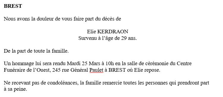 Cet espace « condoléances » est dédié à la mémoire de Monsieur Elie KERDRAON.