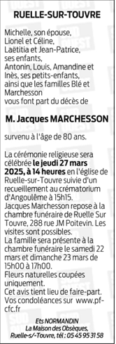 Cet espace « condoléances » est dédié à la mémoire de Monsieur JACQUES MARCHESSON.