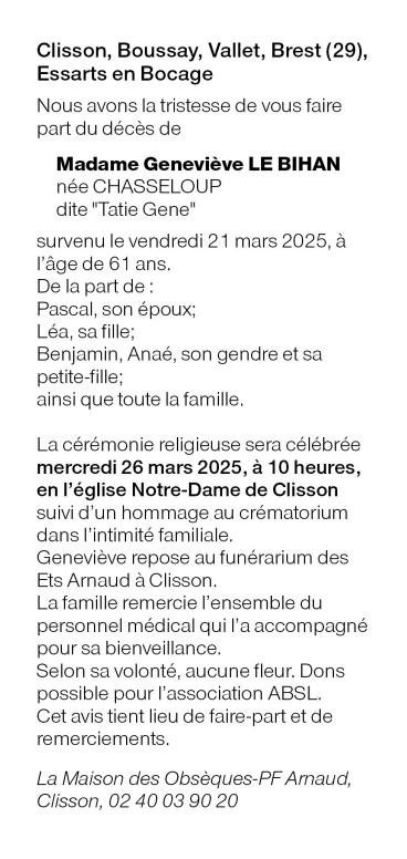 Cet espace « condoléances » est dédié à la mémoire de Madame Geneviève LE BIHAN née CHASSELOUP.