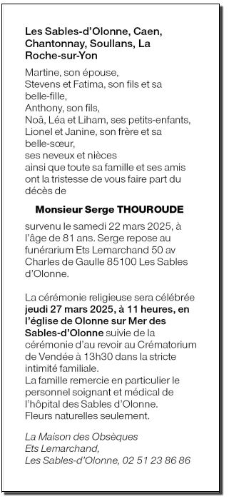 Cet espace « condoléances » est dédié à la mémoire de Monsieur Serge THOUROUDE.