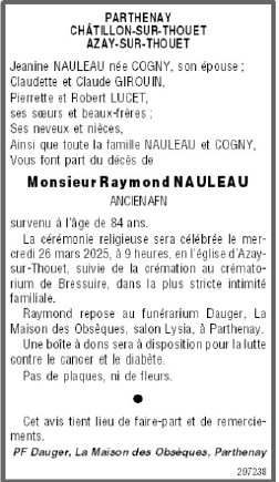 Cet espace « condoléances » est dédié à la mémoire de Monsieur Raymond NAULEAU.