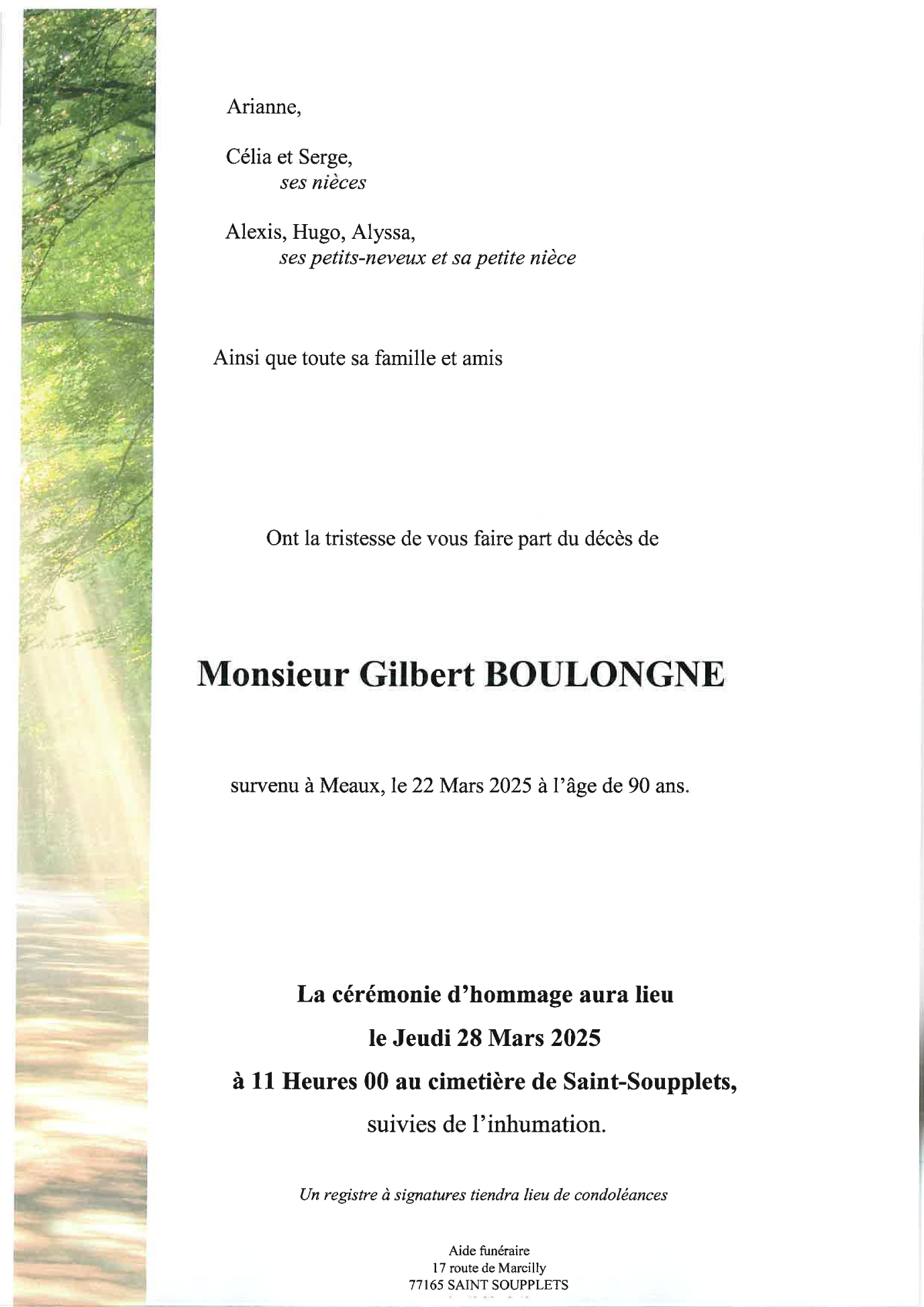 Cet espace « condoléances » est dédié à la mémoire de Monsieur Gilbert BOULONGNE.