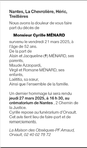 Cet espace « condoléances » est dédié à la mémoire de Monsieur Cyrille MENARD.