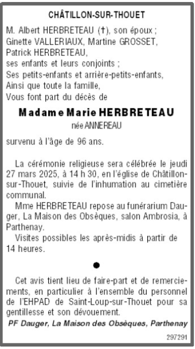 de Madame Marie HERBRETEAU née ANNEREAU