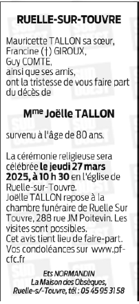 Cet espace « condoléances » est dédié à la mémoire de Madame JOELLE TALLON.