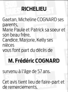 Cet espace « condoléances » est dédié à la mémoire de Monsieur FREDERIC COGNARD.