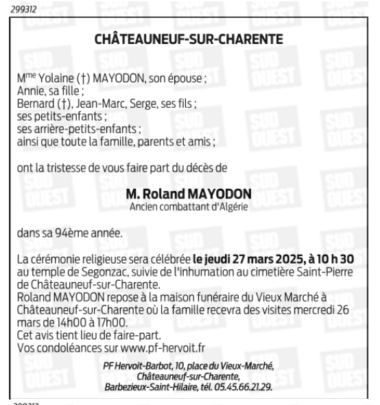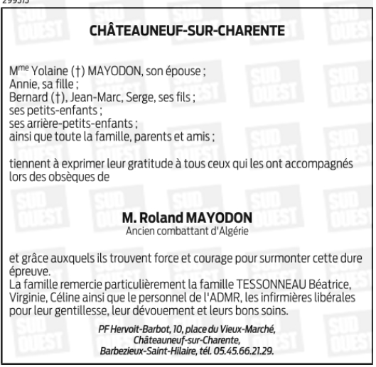 Cet espace « condoléances » est dédié à la mémoire de Monsieur Roland MAYODON.