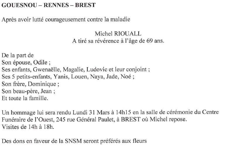 Cet espace « condoléances » est dédié à la mémoire de Monsieur Michel RIOUALL.