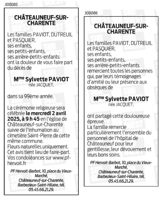 Décédée à Châteauneuf-sur-Charente (16120) le jeudi 27 mars 2025