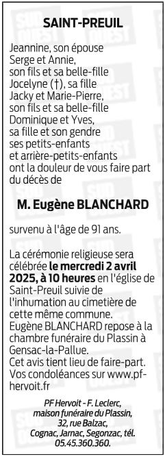 Cet espace « condoléances » est dédié à la mémoire de Monsieur Eugène BLANCHARD.