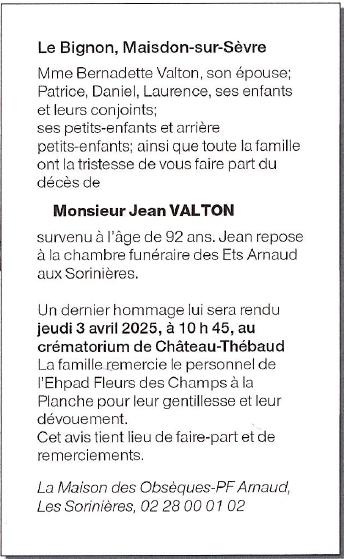 Cet espace « condoléances » est dédié à la mémoire de Monsieur Jean VALTON.