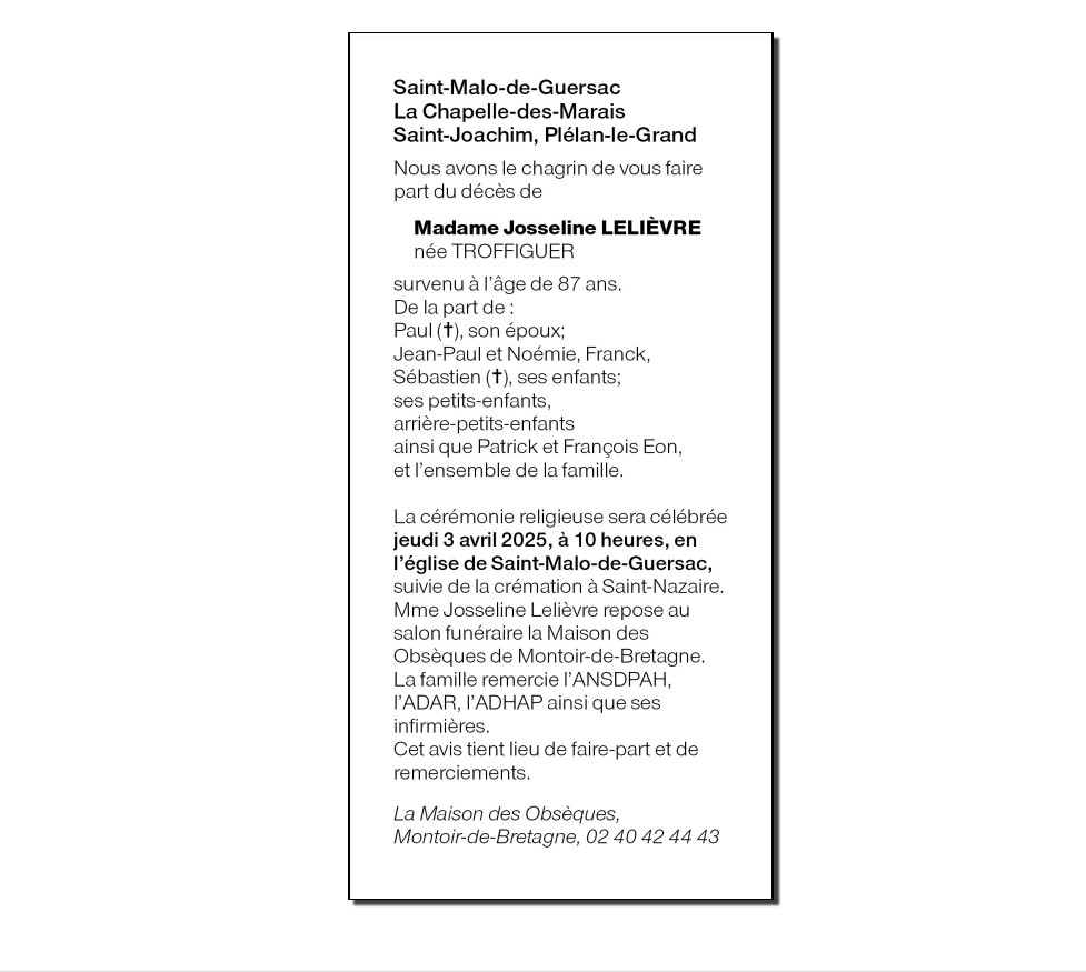 de Madame Josseline LELIÈVRE née TROFFIGUER