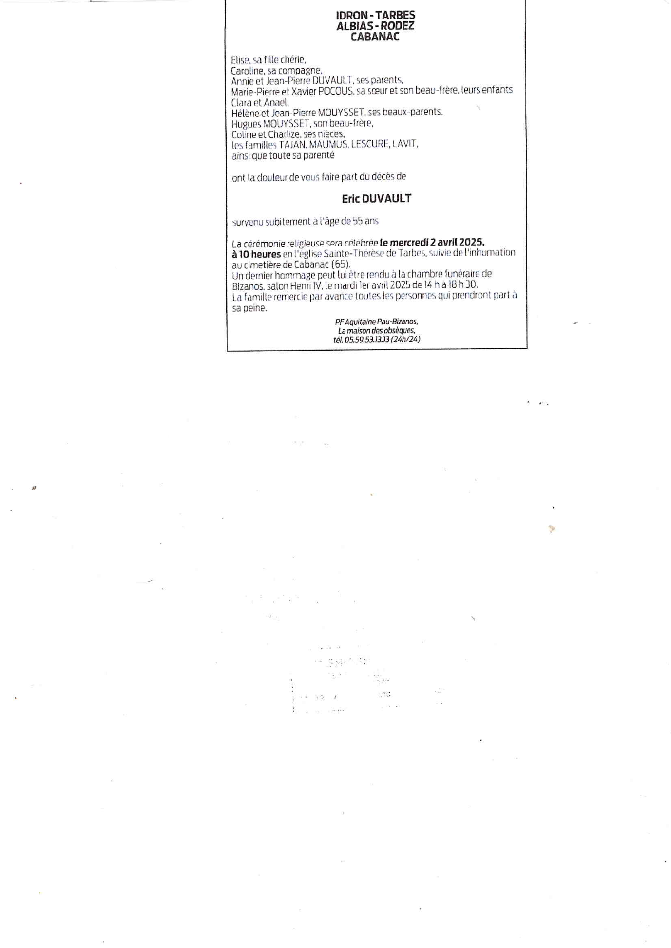 Cet espace « condoléances » est dédié à la mémoire de Monsieur Eric DUVAULT.