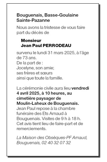 Cet espace « condoléances » est dédié à la mémoire de Monsieur Jean PERRODEAU.