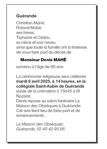 Cet espace « condoléances » est dédié à la mémoire de Monsieur Denis MAHÉ.