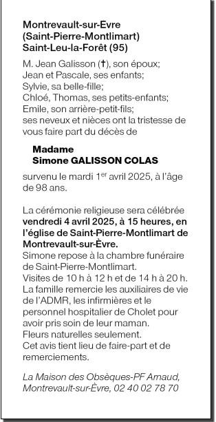 Cet espace « condoléances » est dédié à la mémoire de Madame Simone GALISSON née COLAS.