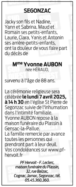 Cet espace « condoléances » est dédié à la mémoire de Madame Yvonne AUBON née HÉRAUD.