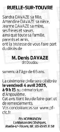 Cet espace « condoléances » est dédié à la mémoire de Monsieur DENIS DAVAZE.