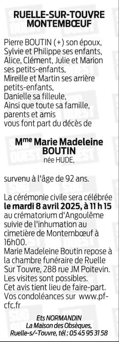 Cet espace « condoléances » est dédié à la mémoire de Madame MARIE MADELEINE BOUTIN née HUDE.
