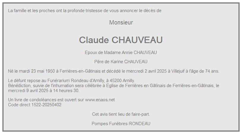 Cet espace « condoléances » est dédié à la mémoire de Monsieur Claude CHAUVEAU.