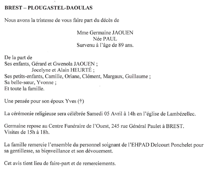 de Madame Germaine JAOUEN née PAUL