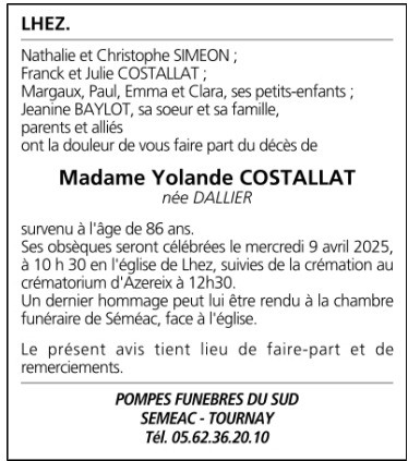 de Madame Yolande COSTALLAT née DALLIER