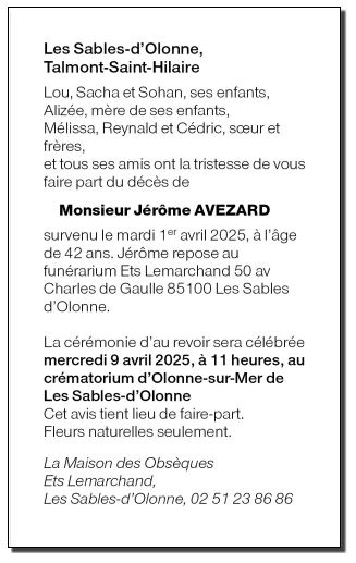Cet espace « condoléances » est dédié à la mémoire de Monsieur Jérôme AVEZARD.