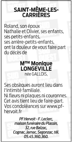 Cet espace « condoléances » est dédié à la mémoire de Madame Monique LONGEVILLE née GALLOIS.