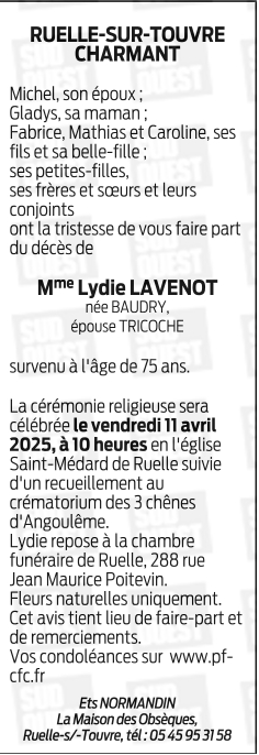 Cet espace « condoléances » est dédié à la mémoire de Madame Lydie TRICOCHE née BAUDRY.