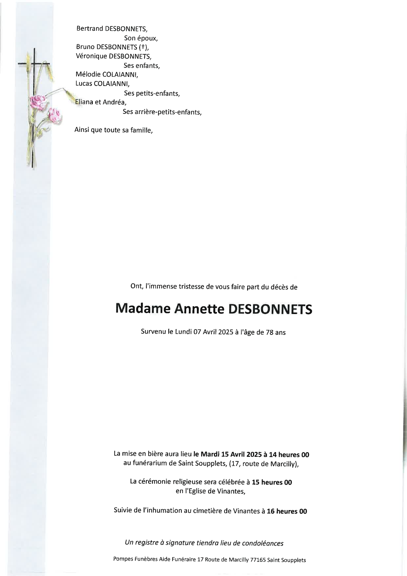 Cet espace « condoléances » est dédié à la mémoire de Madame Annette DESBONNETS née BUISSON.