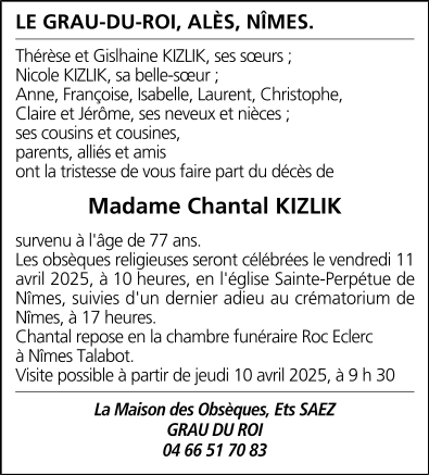 Cet espace « condoléances » est dédié à la mémoire de Madame Chantal KIZLIK.