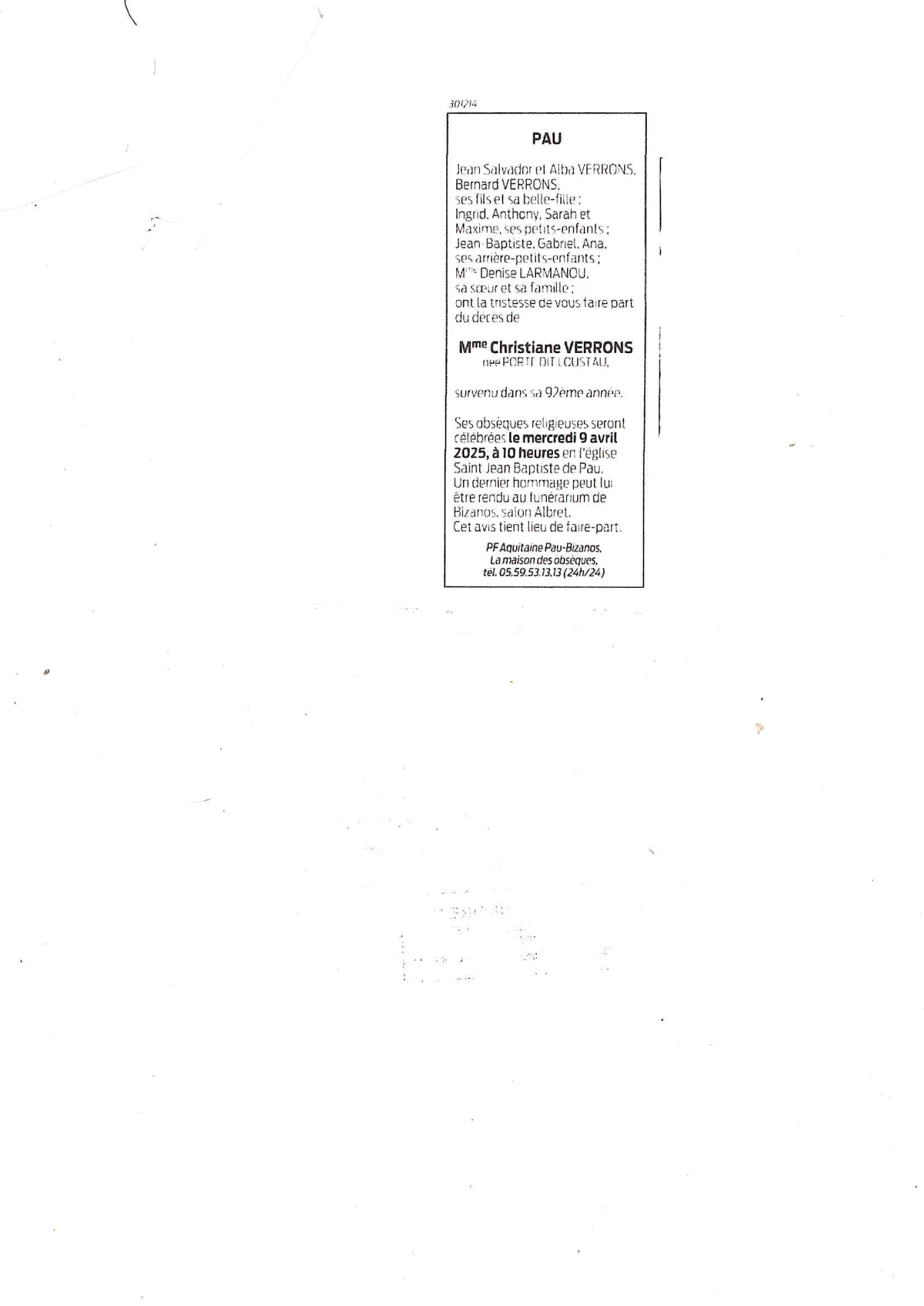 Décédée à Pau (64000) le mercredi 2 avril 2025