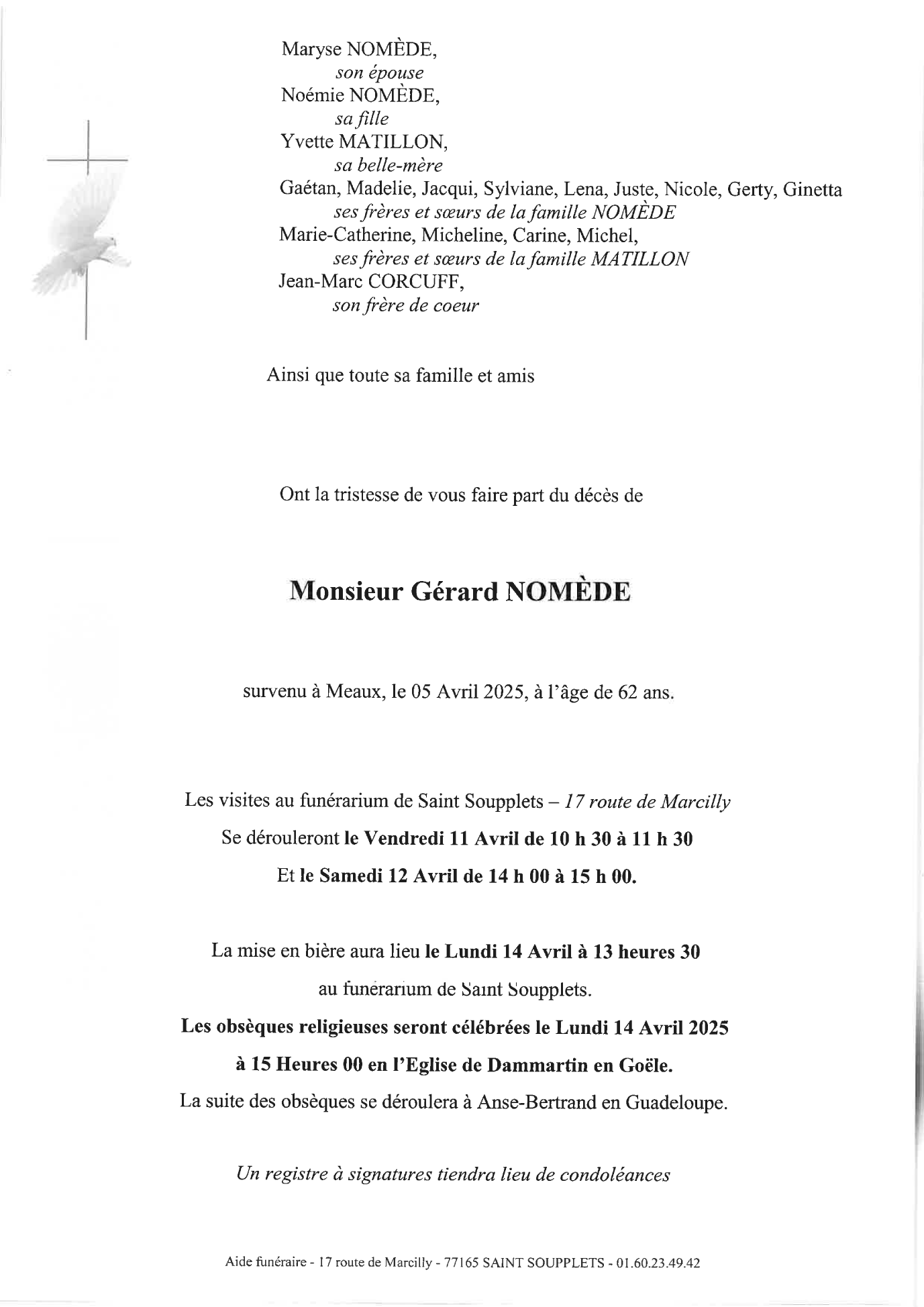 Cet espace « condoléances » est dédié à la mémoire de Monsieur Gérard NOMÈDE.