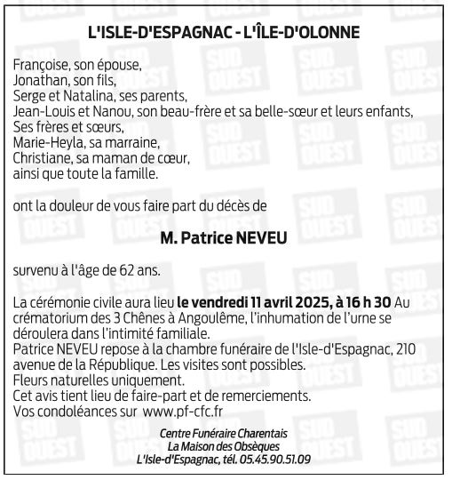 Cet espace « condoléances » est dédié à la mémoire de Monsieur Patrice NEVEU.