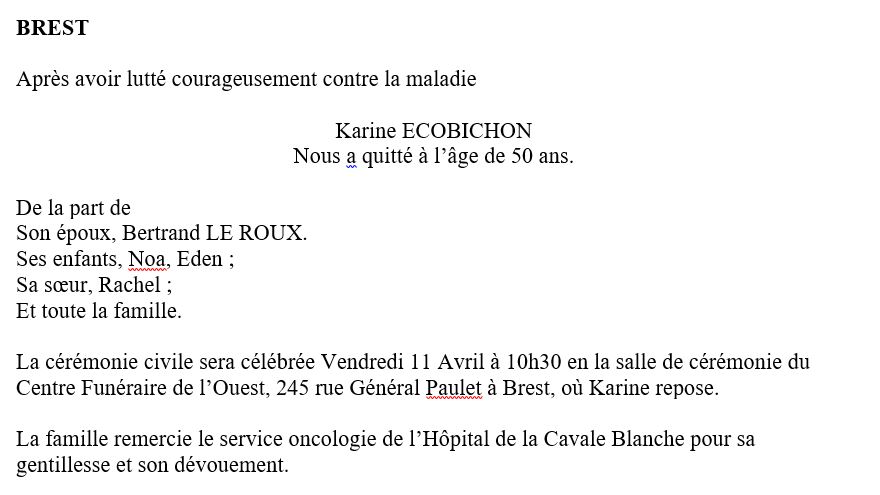 Cet espace « condoléances » est dédié à la mémoire de Madame Karine ECOBICHON.