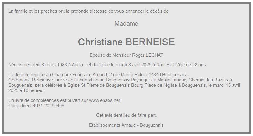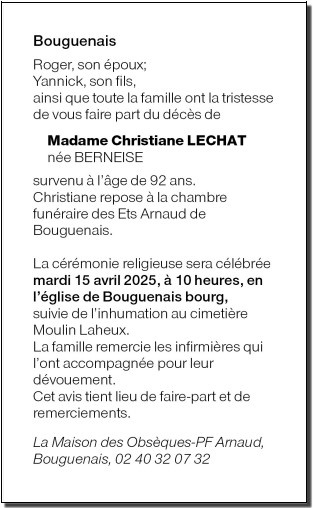 Cet espace « condoléances » est dédié à la mémoire de Madame Christiane LECHAT née BERNEISE.