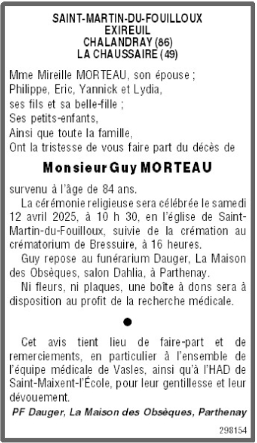 Décédé à Saint-Martin-du-Fouilloux (79420) le mercredi 9 avril 2025